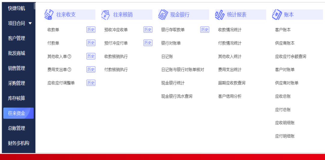 資金管理包含:往來(lái)收支、往來(lái)核銷(xiāo)、現(xiàn)金銀行管理、統(tǒng)計(jì)報(bào)表、往來(lái)賬本、往里對(duì)賬、應(yīng)收應(yīng)付明細(xì)賬等