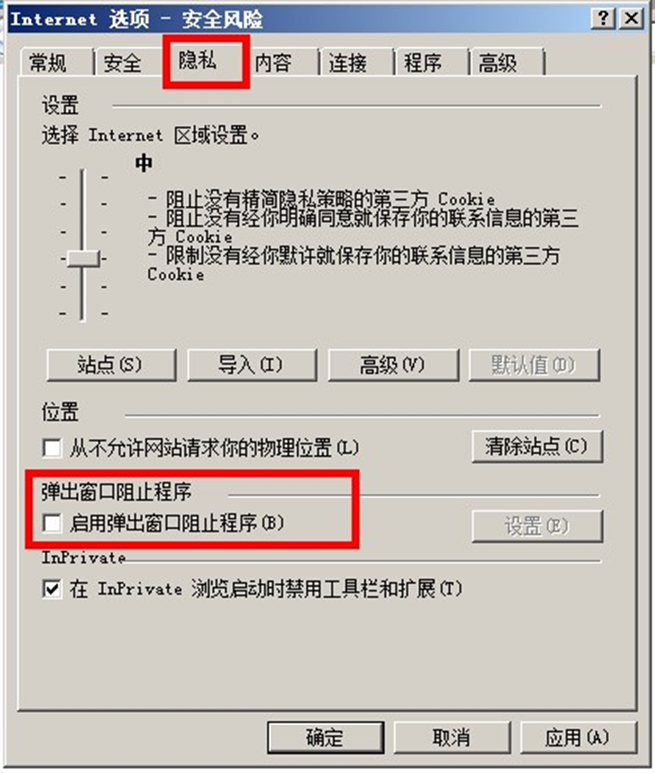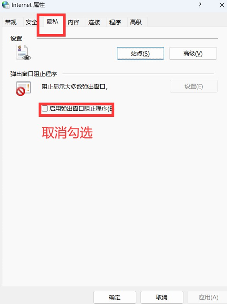 Internet 選項(xiàng)---隱私---取消【啟用彈出窗口阻止程序】