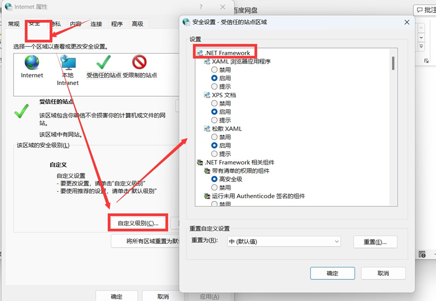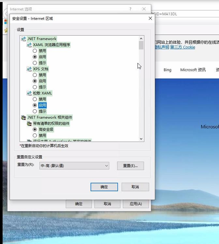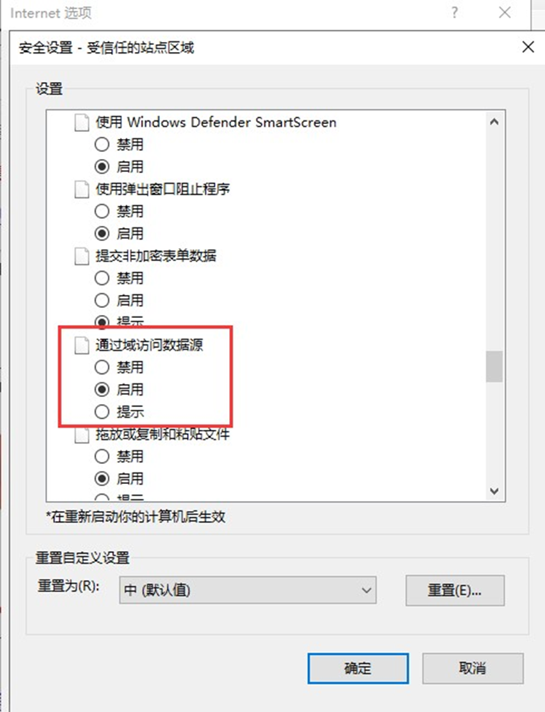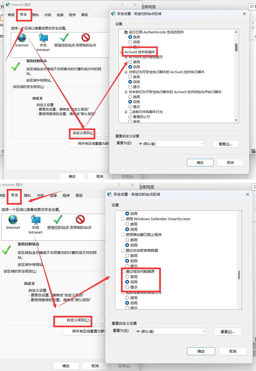 打開(kāi) Internet 選項(xiàng)—自定義級(jí)別把自定義級(jí)別,將.net、腳本以及 ActiveX 相關(guān)項(xiàng)全部啟用;最后在其他中啟用【通過(guò)域訪問(wèn)數(shù)據(jù)源】