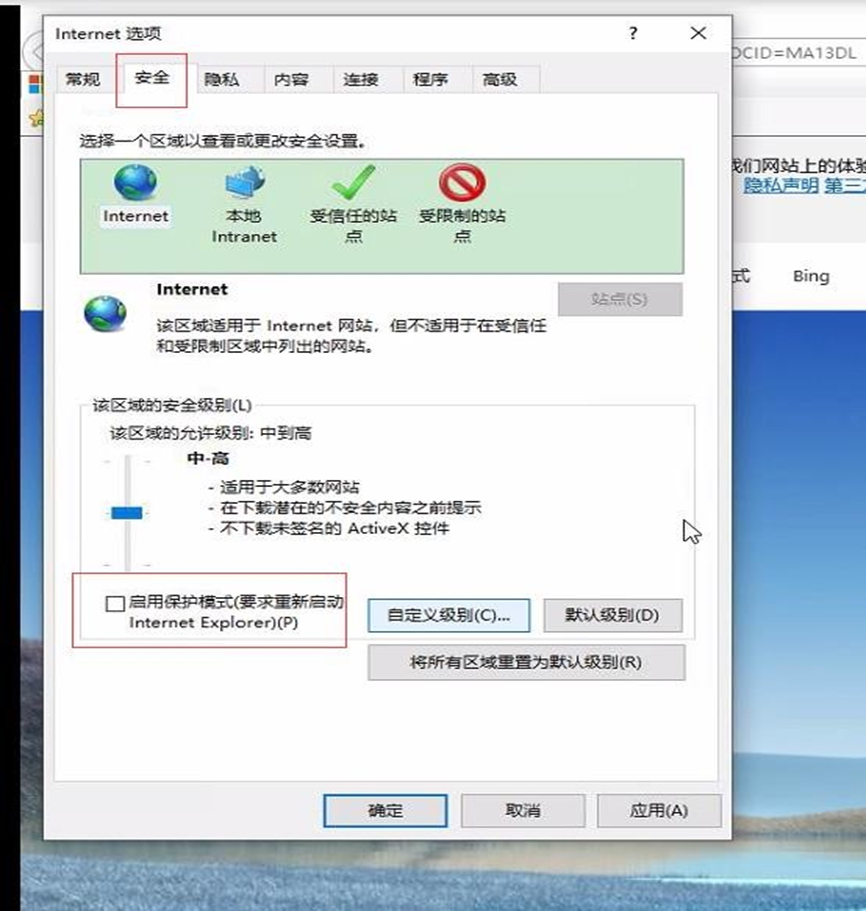 打開(kāi) Internet 選項(xiàng),安全,internet,取消勾選【啟用保護(hù)模式(要求重新啟動(dòng))】