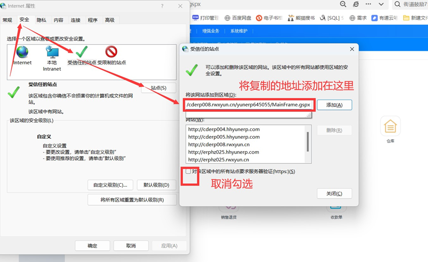 開(kāi)Internet 選項(xiàng)—安全—站點(diǎn)添加可信任站點(diǎn),在受信任站點(diǎn)中取消【對(duì)該區(qū)域中的所有站點(diǎn)要求服務(wù)器驗(yàn)證】,隨后添加 ERP 跳轉(zhuǎn)后的地址以演示賬戶任我行軟件公司為例,將如下兩項(xiàng)添加為受信任站點(diǎn)http://erp001.hhyunerp.com/yunerp583448/Default.gspx http://erp001.hhyunerp.com/yunerp583448/MainFrame.gspx