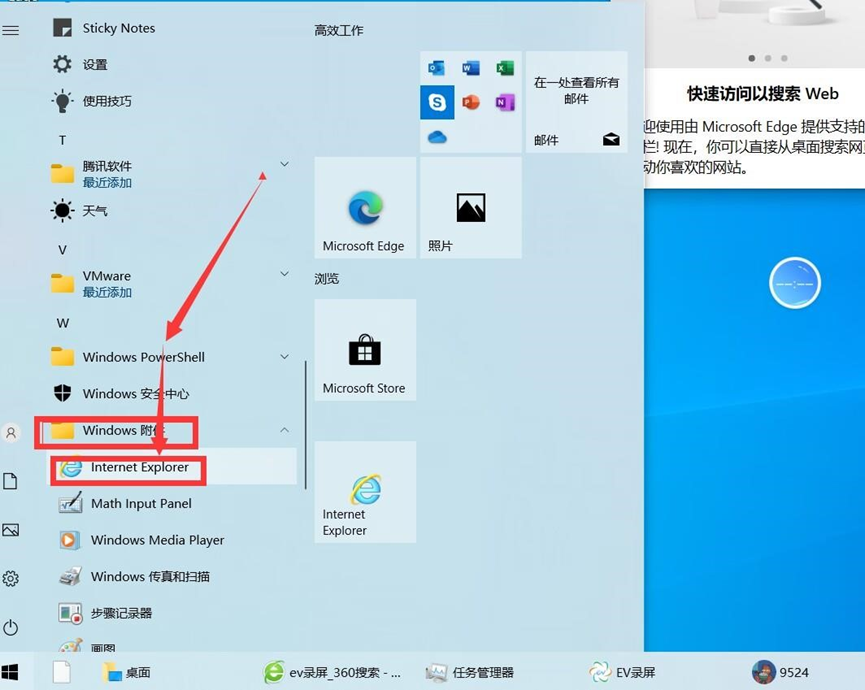 開(kāi)始菜單欄---選擇【附件】---找到 IE 瀏覽器