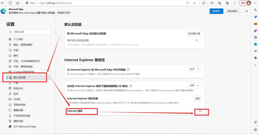用edg 或者 360 安全瀏覽器登錄賬套后復(fù)制登錄后的地址 打開(kāi) edg 瀏覽 -- 設(shè)置 -- 默認(rèn)瀏覽器--Internet 選項(xiàng)