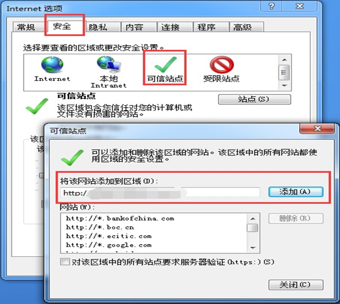 添加可信任站點(diǎn),在受信任站點(diǎn)中取消【對(duì)該區(qū)域中的所有站點(diǎn)要求服務(wù)器驗(yàn)證】,隨
