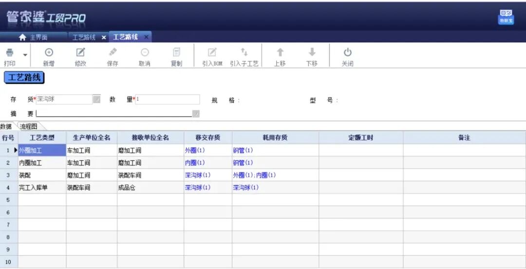 建立客戶(hù)能夠一眼就看懂的工藝流轉(zhuǎn)名稱(chēng)。管家婆工貿(mào)PRO平臺(tái)中折疊工序的處理可以實(shí)現(xiàn)工藝流轉(zhuǎn)的簡(jiǎn)化。 例如,把外圈加工需要的工種(含粗車(chē)第一面粗車(chē)外內(nèi)徑、粗車(chē)第二面粗車(chē)外徑、軟磨平面、軟膜外徑、細(xì)車(chē)外內(nèi)徑車(chē)兩面內(nèi)外倒角、粗車(chē)外溝道、細(xì)車(chē)外溝道、車(chē)溝邊角等)統(tǒng)一命名為外圈加工。
