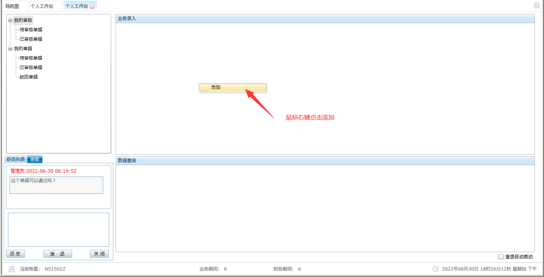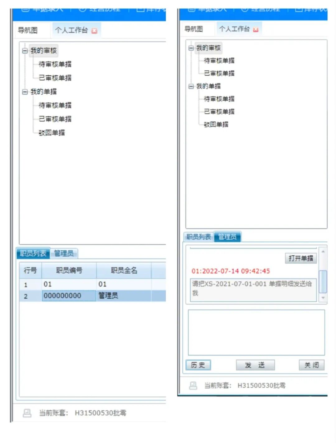 相對于業(yè)務(wù)錄入里面的我的審核功能,個人工作臺集成了左下角的職員間的會話聊天窗口,可以在制作單據(jù)或?qū)徍藛螕?jù)的時候能夠更方便的互相溝通,提高效率,雙擊職員信息,進入聊天界面,點擊【歷史】可以查看歷史消息記錄。