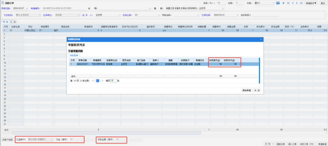Re:系統(tǒng)配置里“銷售訂單生成的【預(yù)收款單/收款單】自動(dòng)過賬”打鉤,銷售訂單生成的【預(yù)收款單/收款單】就會(huì)自動(dòng)過賬,并把預(yù)收的金額反寫到銷售訂單底部的“實(shí)收金額”里。如果這個(gè)配置沒有打鉤,則生成的單據(jù)是草稿,訂金也是沒有收進(jìn)來的,需要手動(dòng)把生成的這張草稿過賬,賬戶才會(huì)增加這筆訂金。 如果系統(tǒng)配置的“銷售訂單有訂金時(shí)自動(dòng)生成【收款單、預(yù)收款單】”沒有打鉤,可以做對(duì)應(yīng)的收款單、預(yù)收款單調(diào)入訂單。如圖: