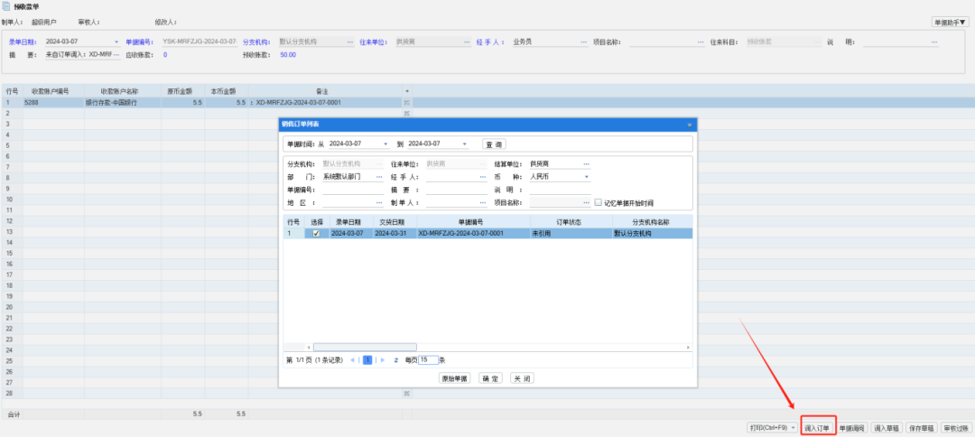 在系統(tǒng)管理—系統(tǒng)啟用—系統(tǒng)配置—銷售單據(jù)配置—銷售訂單有訂金時(shí)自動(dòng)生成【收款單、預(yù)收款單】打鉤,做銷售訂單時(shí)在下面的選擇賬戶輸入訂金,保存訂單后會(huì)自動(dòng)生成對(duì)應(yīng)的單據(jù)草稿。后面做銷售出庫(kù)單調(diào)入訂單就可以選擇預(yù)收資金,輸入收款金額,這樣可以用預(yù)收賬款抵消應(yīng)收賬款。如圖: