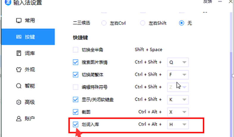 將劃入詞庫的這個(gè)快捷鍵勾選去掉,或者改成別的快捷鍵