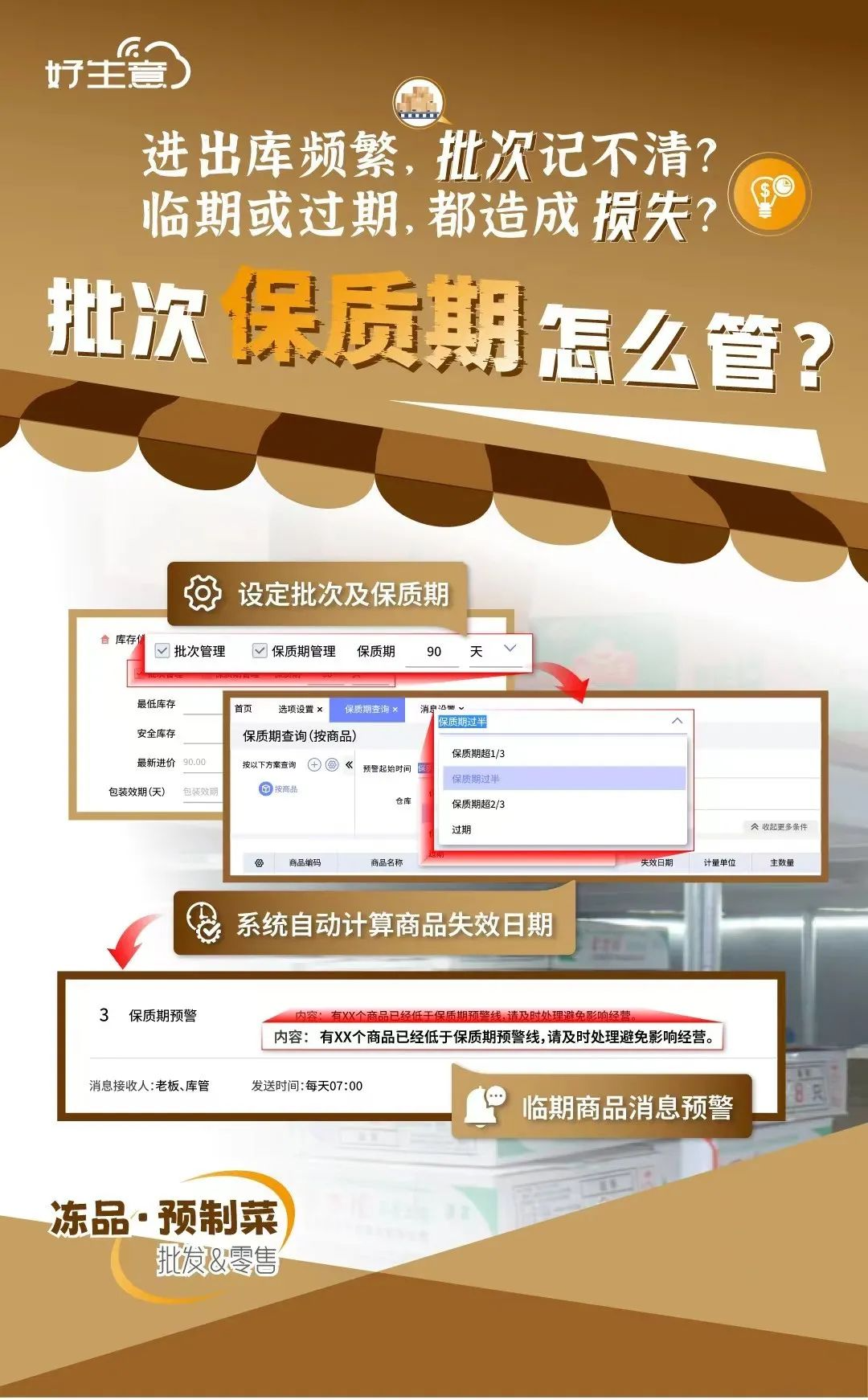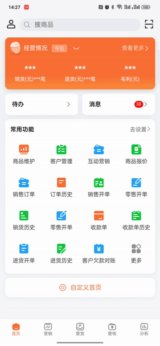 商品一到貨就掃碼入庫,出貨時(shí)再掃一次,庫存自動(dòng)更新。顧客也可以通過掃碼,實(shí)時(shí)了解商品的庫存狀態(tài),讓開單變得既快又準(zhǔn)。 發(fā)貨時(shí)才發(fā)現(xiàn)倉庫不夠貨,又或者是每次盤點(diǎn)后都發(fā)現(xiàn)有一堆貨囤在倉庫后落灰,庫存不足或過剩都會(huì)給生意帶來不便。 好生意進(jìn)銷存,設(shè)置庫存預(yù)警,一旦庫存數(shù)量超過安全值,系統(tǒng)就會(huì)自動(dòng)發(fā)出消息提醒,這樣一來哪些商品缺貨商家就能及時(shí)補(bǔ)貨,哪些商品堆積也能減少采購,后續(xù)再安排進(jìn)一步清倉處理。
