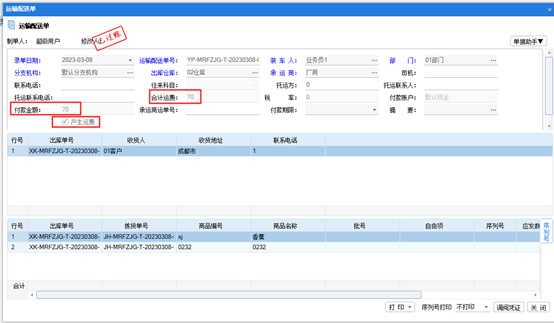 四、倉儲運(yùn)輸管理-倉儲運(yùn)輸管理-運(yùn)輸配送單,做運(yùn)輸配送單調(diào)揀貨單,運(yùn)輸配送單可以勾選產(chǎn)生運(yùn)費(fèi),合計運(yùn)費(fèi)和付款金額必須一致,運(yùn)輸配送單過賬之后,費(fèi)用類項目【運(yùn)雜費(fèi)】會增加,付款賬戶余額減少。