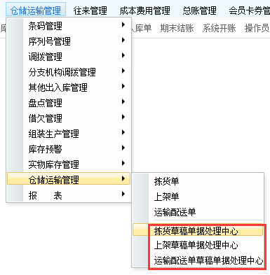 五、報表查詢: 倉儲運(yùn)輸管理下面做的單據(jù),在倉儲運(yùn)輸管理-倉儲運(yùn)輸管理-揀貨草稿單處理中心、上架草稿單據(jù)處理中心、運(yùn)輸配送單草稿單據(jù)處理中心,這3個報表查詢。