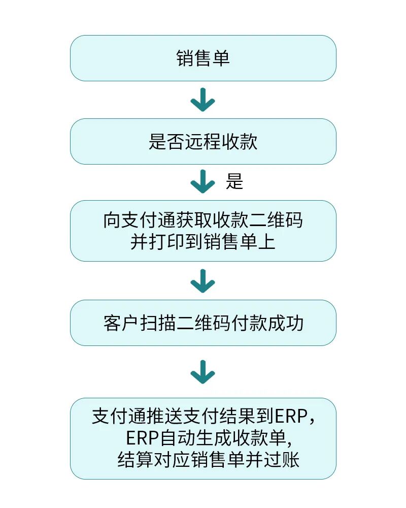 (2)二維碼遠(yuǎn)程收款金額,計(jì)算公式為: 客戶(hù)通過(guò)手機(jī)掃碼完成付款后,支付通推送支付成功的結(jié)果至ERP后臺(tái),自動(dòng)生成收款單,結(jié)算對(duì)應(yīng)銷(xiāo)售單并過(guò)賬。