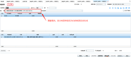 【規(guī)則說(shuō)明】 a.由于支付通掃碼支付為全額支付,推送ERP后臺(tái)自動(dòng)生成收款單,可支持當(dāng)前所有的結(jié)算方式:按單據(jù)結(jié)算、按金額結(jié)算、按商品結(jié)算。 b.自動(dòng)推送生成的收款單,需在表頭字段【摘要】?jī)?nèi),填充二維碼掃碼支付信息,便于用戶(hù)進(jìn)行區(qū)分和報(bào)表查詢(xún);表頭字段【付款單位】、【經(jīng)手人】,需調(diào)取原單銷(xiāo)售單字段信息。 c.自動(dòng)推送生成了收款單,意味著收款已完成,由于需與支付通收款記錄對(duì)應(yīng),收款單將不支持進(jìn)行修改、刪除、紅沖。 d.收款單所調(diào)用的銷(xiāo)售單,也是同理,收款完成后,不支持進(jìn)行修改、刪除、紅沖。