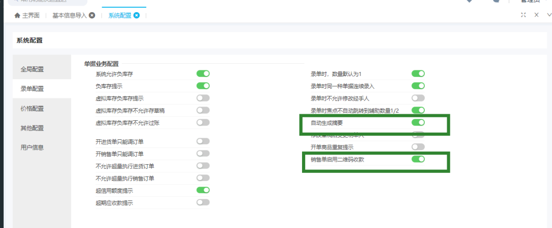 (1)先對(duì)接支付通,完成了支付通相關(guān)賬戶(hù)設(shè)置。 (2)管理員登錄在系統(tǒng)維護(hù)-系統(tǒng)管理-用戶(hù)配置-錄單配置-勾選啟用【銷(xiāo)售啟用二維碼收款】 、【自動(dòng)生成摘要】,新賬套默認(rèn)不勾選。