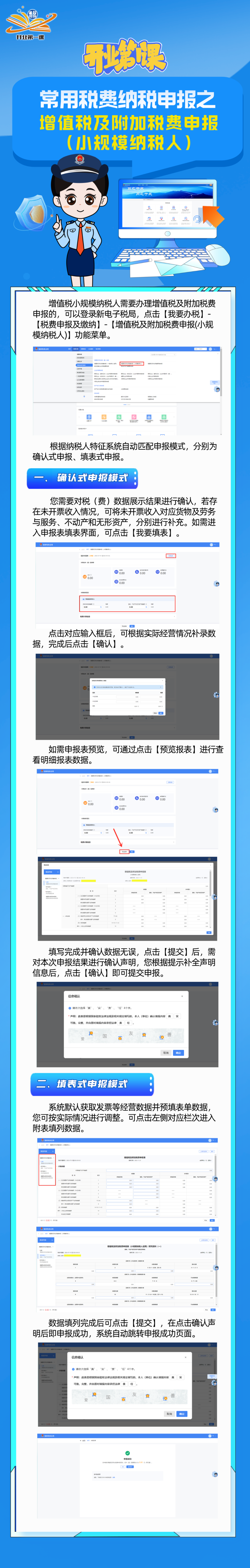 開展面向新辦納稅人的“開業(yè)第一課”活動是今年稅務(wù)部門“便民辦稅春風(fēng)行動”的重要內(nèi)容。為幫助新辦納稅人更好了解新辦企業(yè)涉及的稅費事項及辦理流程,我們將陸續(xù)推出“開業(yè)第一課”系列宣傳輔導(dǎo)產(chǎn)品,幫助納稅人盡快度過“新手期”,更好開展經(jīng)營活動。 今天帶你了解:常用稅費納稅申報之增值稅及附加稅費申報(小規(guī)模納稅人適用)。