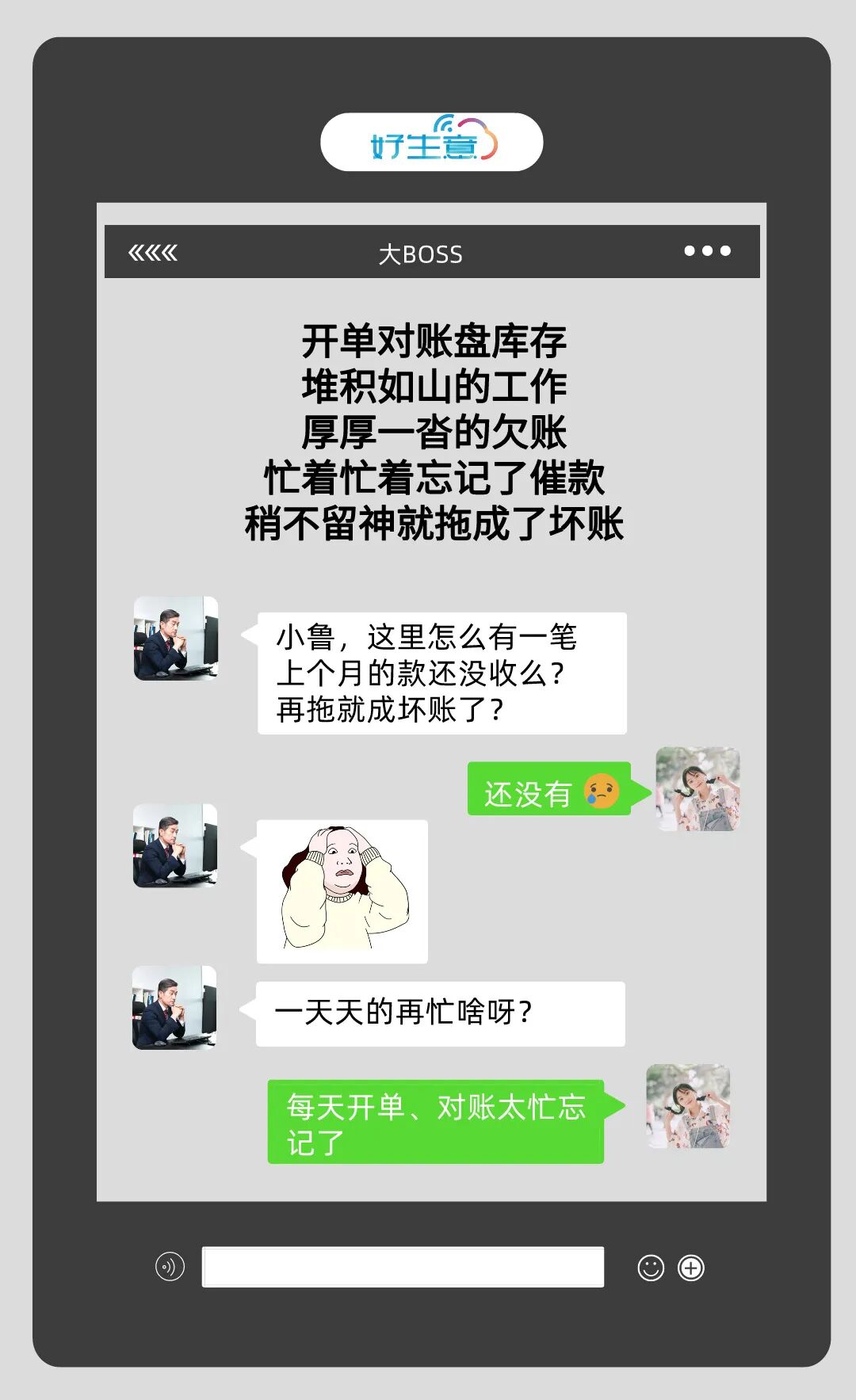 今天“好生意”就來(lái)給各位老板排憂解難,看看常見(jiàn)的貨款收不回來(lái)的原因有哪些,咱們好生意進(jìn)銷存又是如何一一應(yīng)對(duì)的! 一到季度末算賬,老板們經(jīng)常會(huì)發(fā)現(xiàn),哎呀,上個(gè)月的、上上月的,甚至更早的賬單還沒(méi)收錢呢。 每天那么多事兒,腦袋瓜子怎么記得住那么多?所以,很多時(shí)候就忘了該收的錢,時(shí)間一長(zhǎng),賬單就變成了壞賬。