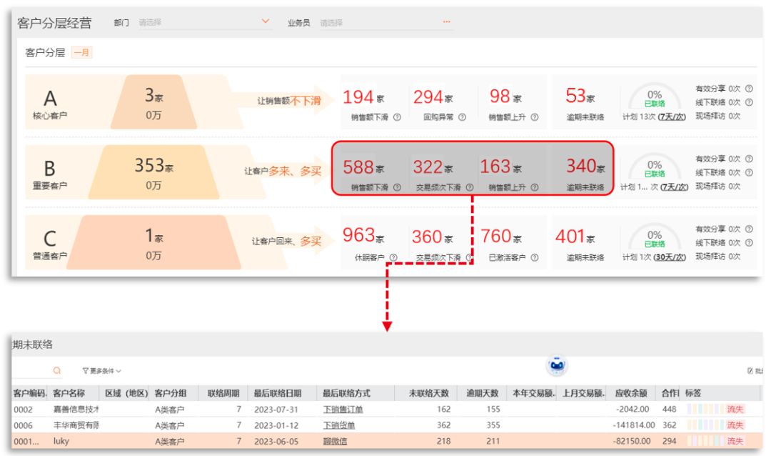 客戶分成A、B、C三個等級 什么樣的客戶該用什么樣的方式維護(hù),一目了然 好生意還可以自動對客戶進(jìn)行分層,幫助企業(yè)掌握客戶結(jié)構(gòu)狀態(tài),為客戶運營指明方向