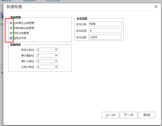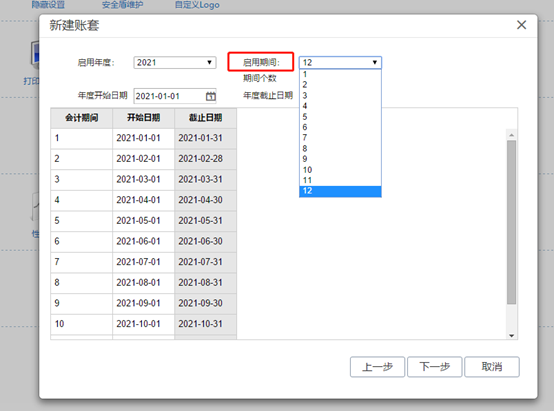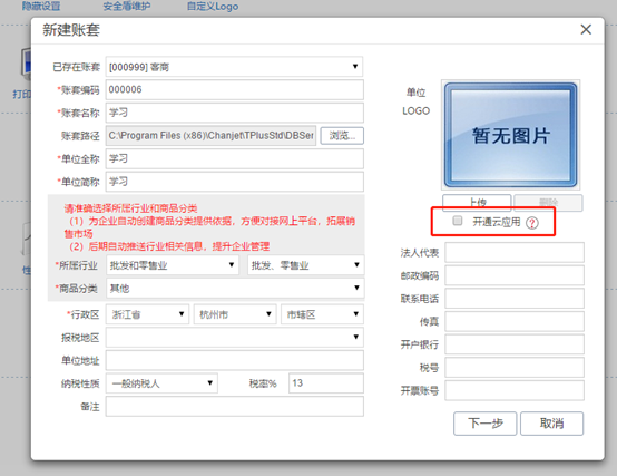 注意,記得去掉右側(cè)的開通云應(yīng)用的勾。 點擊下一步,來到該頁面,選擇相應(yīng)的啟用期間,賬套從幾月份開始就選擇幾月份。