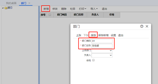 點擊新增,然后輸入部門編碼、部門名稱,最后點擊保存。