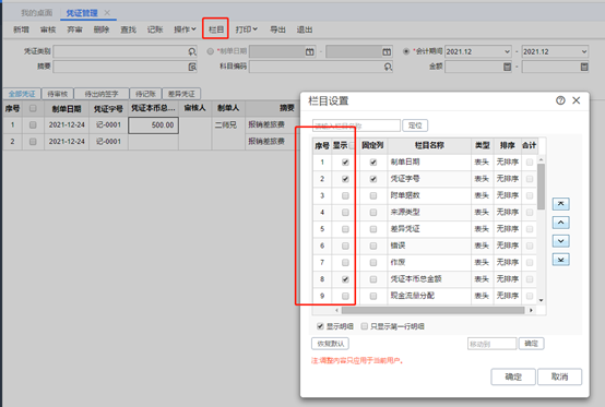 憑證輸出 若是想要輸出序時賬,可以在憑證管理界面的欄目里選擇要顯示的內(nèi)容,最后導(dǎo)出成excel。