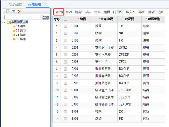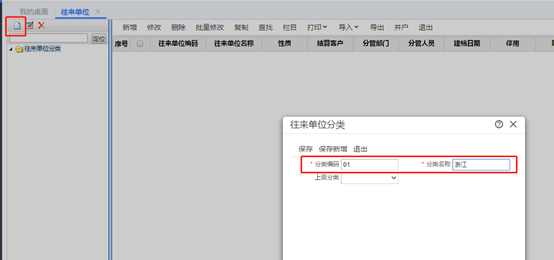 在左側(cè)增加往來分類,然后輸入往來分類編碼、分類名稱,最后點擊保存。
