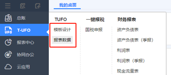 6.T-UFO報表 點擊T-UFO->報表數(shù)據(jù),日常報表取數(shù)在報表數(shù)據(jù),要修改公式,做報表模板則是在模板設(shè)計中。