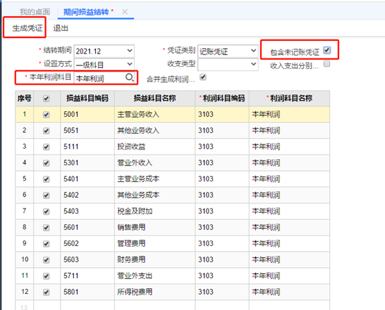 選擇本年利潤科目,勾選[包含未記賬憑證],點擊生成憑證,也可以選擇收入費用分開結(jié)轉(zhuǎn)。