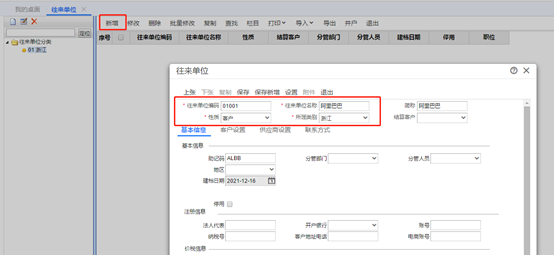 點擊增加按鈕,然后輸入往來單位編碼、往來單位名稱、性質(zhì)、所屬類別,最后點擊保存。