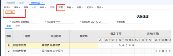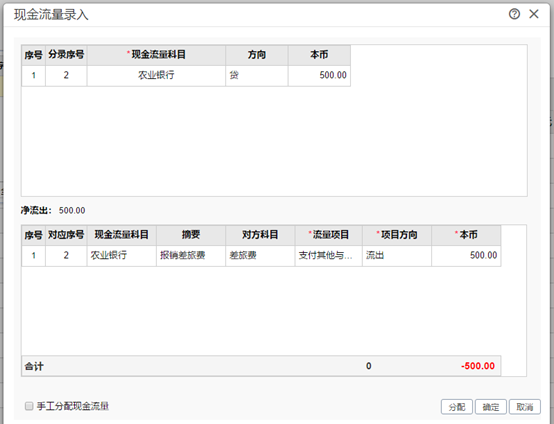 保存成功后,若是左上角出現(xiàn)已分配,則說明現(xiàn)金流量項目已自動分配好,可以點擊上面的流量按鈕進去查看,或者手工分配。