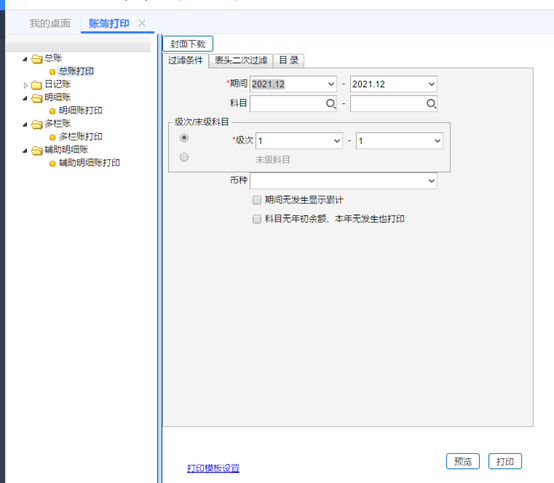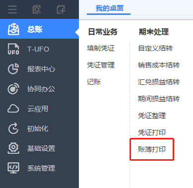 ⑤賬簿打印 點擊總賬->賬簿打印。
