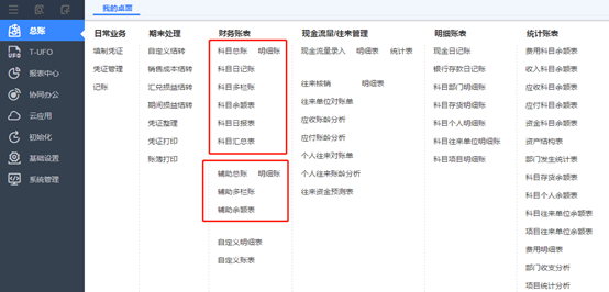 ④賬簿查詢 上面的為普通賬簿的查詢,下面的為輔助賬簿查詢。