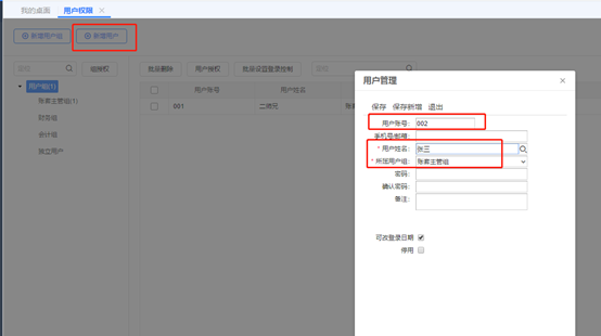 點擊新增用戶,輸入用戶賬號、用戶姓名、所屬用戶組、密碼,最后點擊保存。