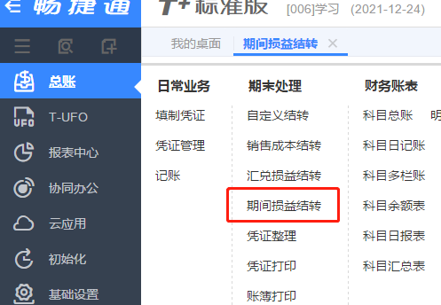③期間損益結(jié)轉(zhuǎn) 點擊總賬->期間損益結(jié)轉(zhuǎn)。