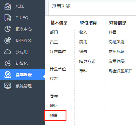 ④項目的增加、刪除、修改 若是想要進行項目輔助核算,點擊基礎(chǔ)設(shè)置->項目。