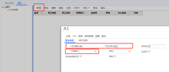 點擊增加,然后輸入員工編碼、員工名稱、所屬部門,最后點擊保存。