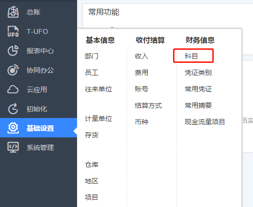 ⑤科目增加、刪除、修改以及輔助核算設(shè)置 點擊基礎(chǔ)設(shè)置->科目。