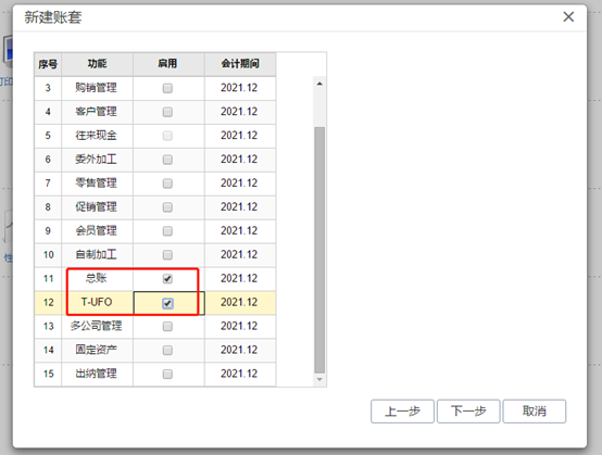 點擊下一步,勾選上要啟用的模塊,下面以總賬、T-UFO報表為例。