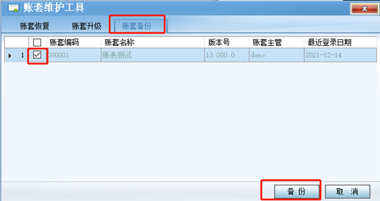 選擇[賬套備份],勾選上將要備份的賬套,點擊[備份]按鈕,選擇保存的路徑并等待備份成功。