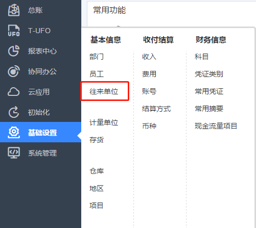③往來單位的增加、刪除、修改 若是想要進行往來輔助核算,點擊基礎(chǔ)設(shè)置->往來單位。