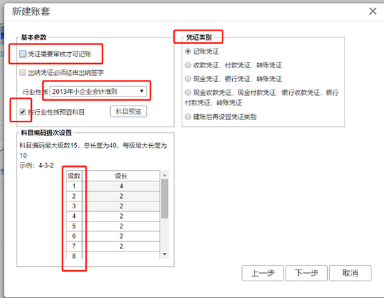 點擊下一步,根據(jù)實際需要選擇科目制度的行業(yè)性質(zhì),其中科目級次可以增加,憑證類別也根據(jù)實際需要進行選擇,若是不想審核的話可以去掉[憑證需要審核才可記賬]的勾。
