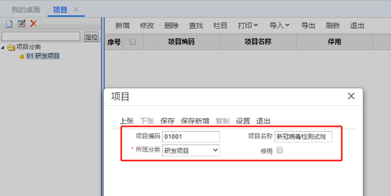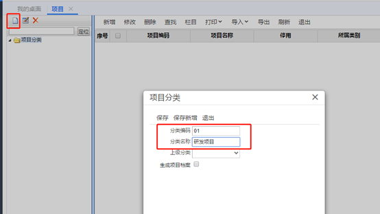 在左側(cè)增加項目分類,然后輸入項目分類編碼、項目分類名稱。