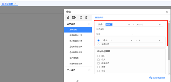 科目余額表 根據(jù)實際需要選擇條件,若是想看輔助項的余額,可以勾選下面的選項。