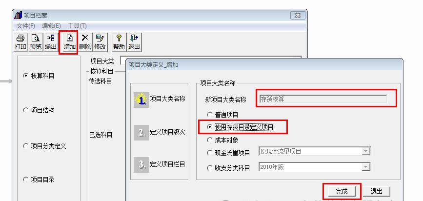 2.點(diǎn)擊增加選中使用存貨目錄定義項(xiàng)目則新添項(xiàng)目大類存貨核算后點(diǎn)擊完成:
