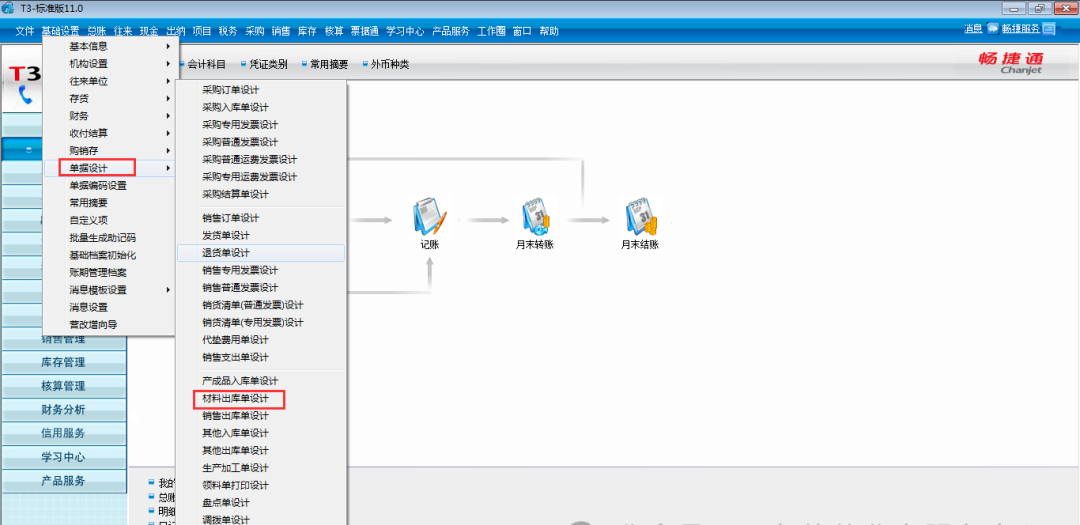 二、添加材料出庫(kù)單的表體-項(xiàng)目編碼和項(xiàng)目大類編碼 1.依次點(diǎn)擊基礎(chǔ)設(shè)置-單據(jù)設(shè)計(jì)-材料出庫(kù)單設(shè)計(jì):