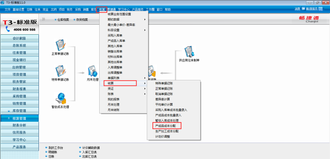 五、進(jìn)行產(chǎn)成品成本分配 1.依次點(diǎn)擊核算-核算-產(chǎn)成品成本分配