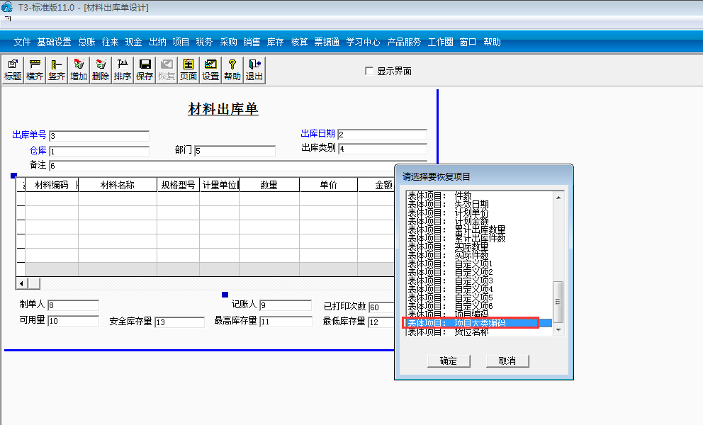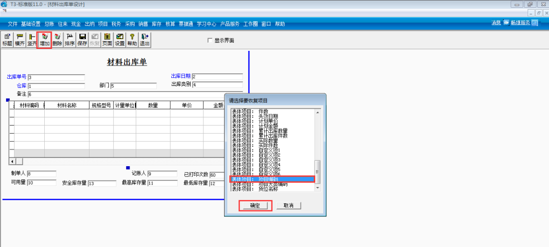 2.依次點(diǎn)擊增加,選中表體項(xiàng)目:項(xiàng)目編碼點(diǎn)擊確定: