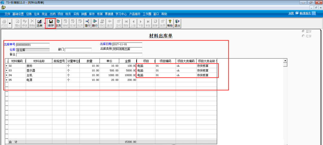 三、填寫材料出庫(kù)單(由于工作需要,同時(shí)領(lǐng)用了2個(gè)電源) 注:鼠標(biāo)、顯示器、主機(jī)需要選中項(xiàng)目編碼(帶出項(xiàng)目)和項(xiàng)目大類編碼(帶出項(xiàng)目大類名稱)如圖: