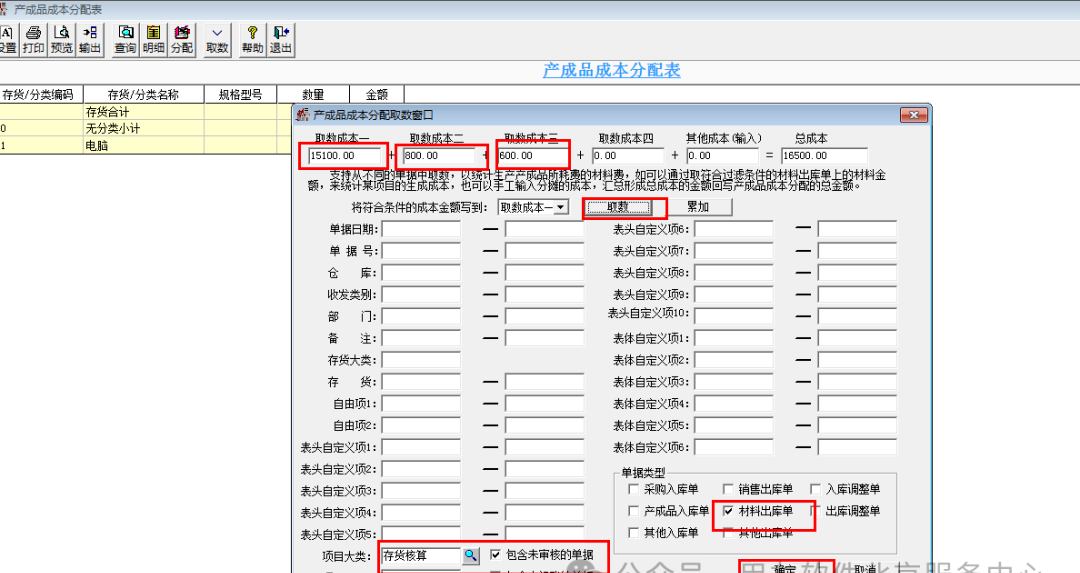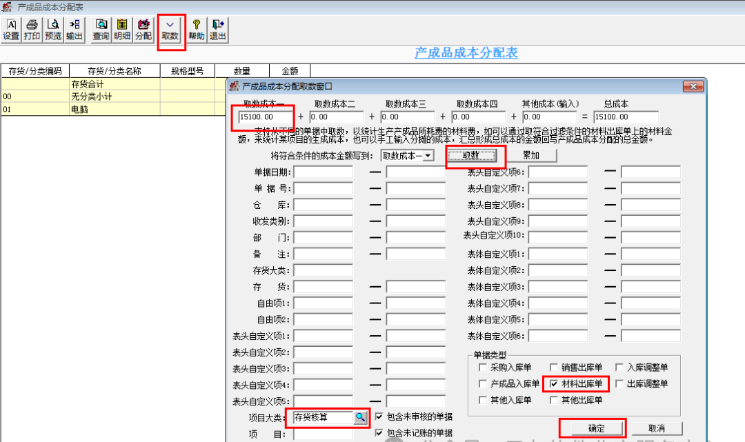 3.點(diǎn)擊取數(shù),在分配取數(shù)窗口項(xiàng)目大類選中存貨核算,單據(jù)類型中選擇材料出庫(kù)單 點(diǎn)擊取數(shù),取數(shù)成本一則會(huì)自動(dòng)取數(shù),確定退出即可,如圖: