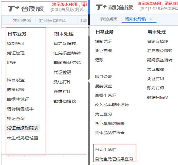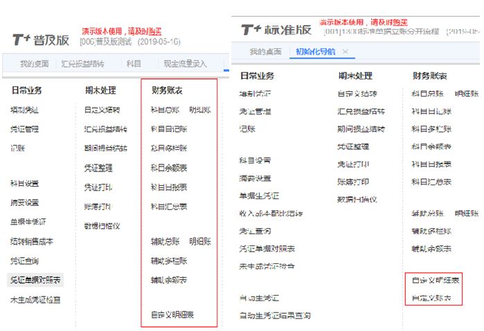 T+發(fā)版由來已久,但依舊有很多伙伴和客戶會致電來問,T+的普及版、標準版、專業(yè)版到底有哪些差異? 新用戶在選購軟件時,會糾結:我選擇哪個版本更合適? 老用戶在后期使用時,會遇上: “公司擴大規(guī)模,想增購站點;” “應付職工薪酬能否按員工類別來做輔助核算?” “聽說T+13.0能自動生成憑證,為什么我的軟件里沒有?” “……” 這時服務商告訴我必須升級軟件版本?為什么呢? 不同的軟件版本適合不同規(guī)模、不同需求的企業(yè),今天服寶就以T+最新版本13.0的總賬模塊來舉例,說說三個版本之間的功能差異。 1、商務區(qū)別 ? 普及版: 1. 購買普及版總賬模塊贈送出納模塊和站點,下單時只要勾選普及賬表,默認包含出納模塊; 2. 財務模塊普及賬表只能訂購1個站點,普及進銷存可以選擇性購買1個或3個或5個站點; ? 標準版&專業(yè)版: 1. 購買總賬只送出納模塊不送站點,即出納模塊使用要占用財務站點,下單時需要勾選出納模塊; 2. 不做站點數(shù)限制; ? 總結: ![]() 2、模塊區(qū)別 ▼ 總賬菜單 ? 普及版: ![]() ? 標準版: ![]() ? 專業(yè)版: ![]() ▼ 輔助核算項 ? 普及版: 普及版只有部門、個人、往來單位、存貨、項目五個常規(guī)輔助核算。 ![]() ? 標準版&專業(yè)版: 標準版和專業(yè)版除這五個常規(guī)輔助核算外還可以設置10個擴展輔助核銷項,更大程度的給予企業(yè)特殊核算自由。舉個例子:當應付職工薪酬需要按照人員類別來核算時,可以使用擴展輔助核銷項,新增“人員類別”并勾選即可。 ![]() ▼ 日常業(yè)務 ? 普及版: 無法自動生成憑證,需要時手工勾選生成; ? 標準版&專業(yè)版: 可配置周期等條件,自動生成憑證; ![]() ▼ 期末處理功能 ? 普及版: 普及版支持自定義轉賬設置,但只能設置對應結轉,不能選擇公式結轉方式; ? 標準版&專業(yè)版: 可選擇對應結轉、公式結轉兩種結轉方式; ![]() ▼ 財務賬表 ? 普及版: 財務賬表支持自定義明細表,但不能設置自定義賬表; ? 標準版&專業(yè)版: 支持自定義明細表,也可以自定義賬表; ![]() ▼ 統(tǒng)計賬表 ? 普及版: 不支持費用明細表、部門收支分析、項目統(tǒng)計分析這3張賬表的查詢; ? 標準版&專業(yè)版: 支持費用明細表、部門收支分析、項目統(tǒng)計分析等查詢; ![]() ? 模塊功能總結: ![]() 以上就是T+普及版、標準版、專業(yè)版 總賬模塊的功能區(qū)別,希望能給新老用戶在購買和升級軟件時提供一個參考。